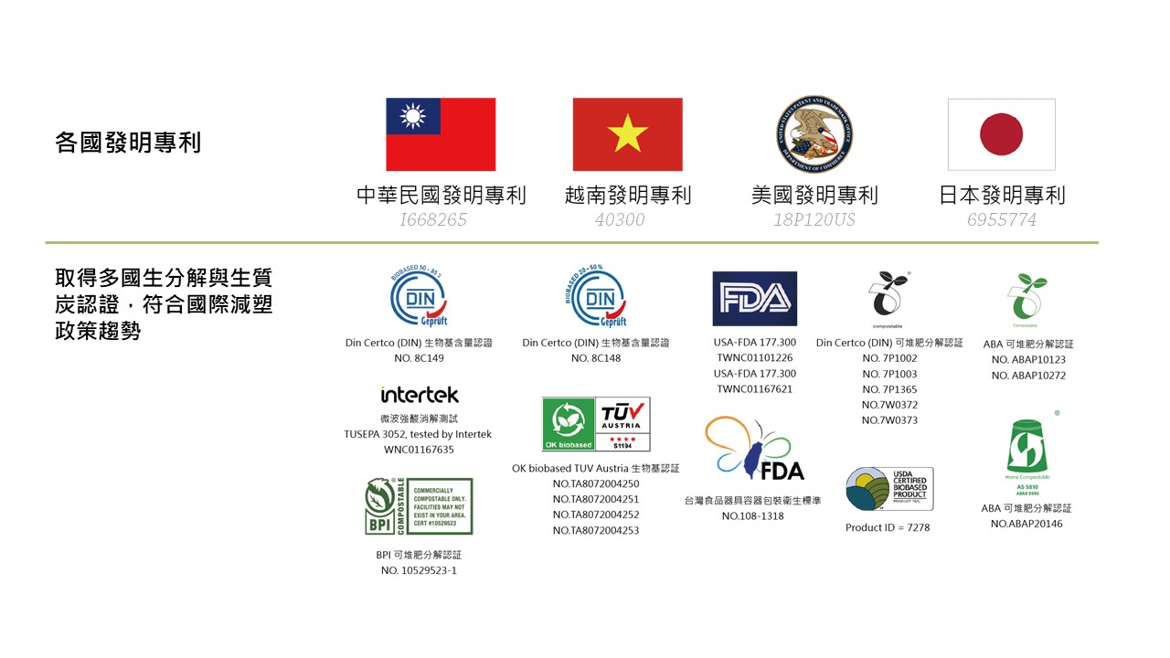 以材料科學為核心,開發可量產且具成本競爭力的客製化配方系統,產品採無塑材料設計,具備無毒分解特性,符合家庭堆肥、可降解材料與可堆肥產品之應用標準