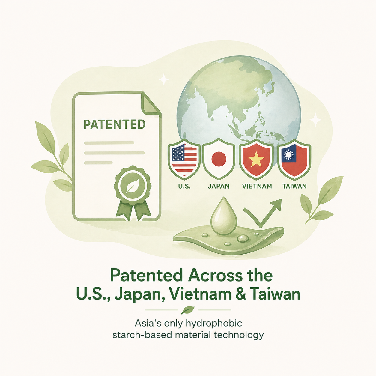 With patented biobased formulations and advanced polymer technology, Green World has solved the key challenges of traditional bioplastics—moisture absorption, mold growth, and softening. Its molecular-level hydrophobic design keeps the material dry, stable, and mold-free even under long-term humidity.