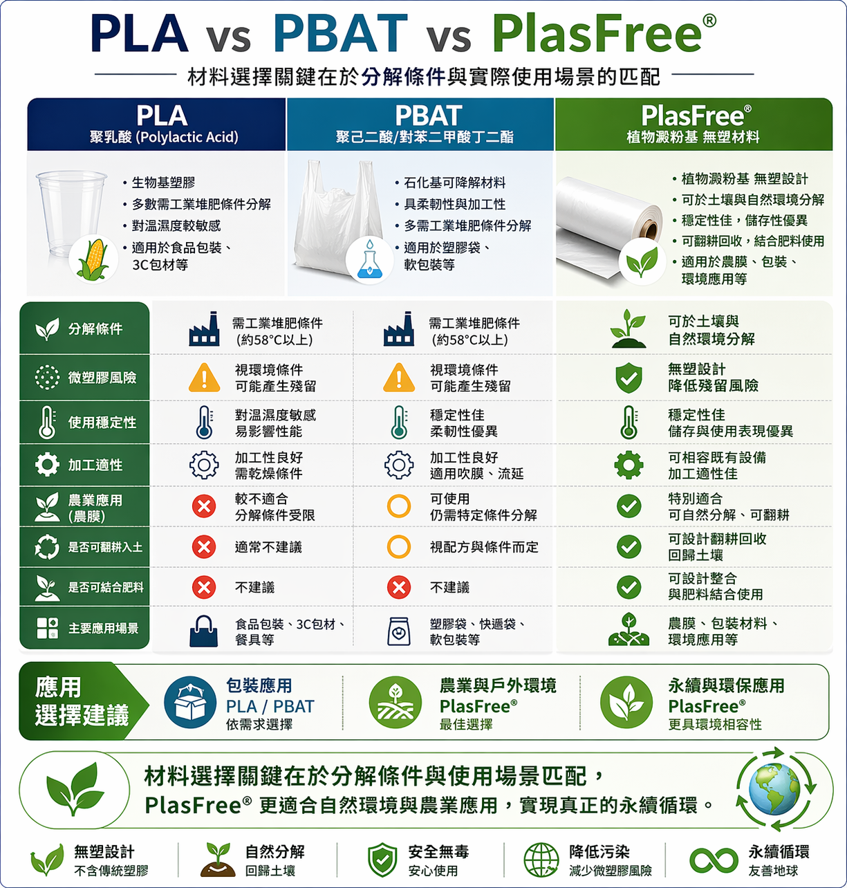 隨著環保法規與減塑需求持續提升,「可降解材料」已成為包裝、農業與工業應用的重要發展方向。目前市場上常見的材料主要包括 PLA(聚乳酸)、PBAT,以及新一代植物澱粉基材料(如 綠世界PlasFree®)。然而,不同材料在分解條件、使用穩定性與實際應用上存在顯著差異。